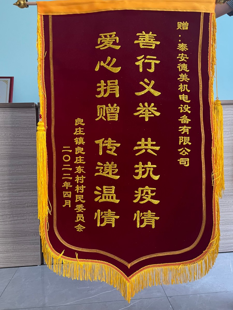 近日,良莊鎮(zhèn)良莊東村村民委員會(huì)將寫有“善行義舉,共抗疫情,愛心捐贈(zèng),傳遞溫情”的錦旗送到泰安德美機(jī)電設(shè)備有限公司,對(duì)本次抗擊疫情所做貢獻(xiàn)給予充分肯定!