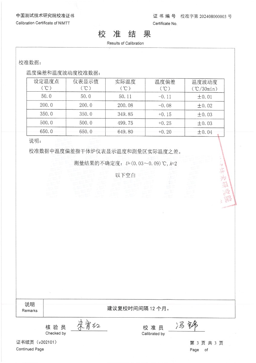 干體爐300(室溫+5℃~650℃)校準證書 2024-8-5 本文被閱讀 7458 次