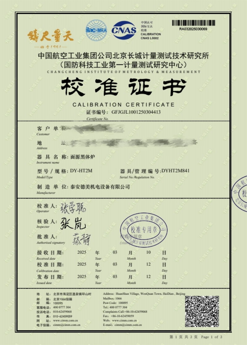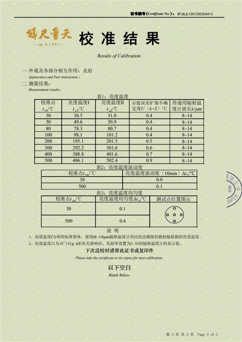 面源黑體爐(室溫+5-500℃)校準(zhǔn)證書 2025-3-15 本文被閱讀 6334 次