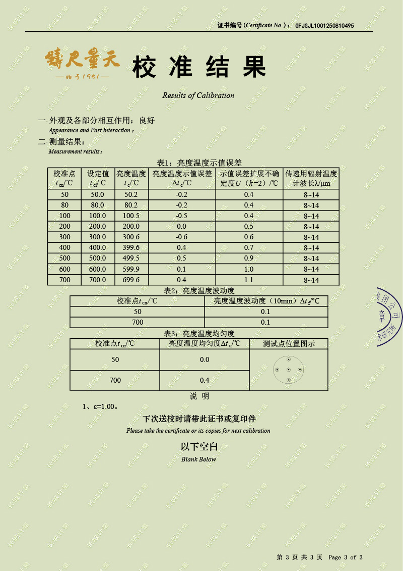 腔式黑體輻射源(50-700℃)校準證書 2025-9-3 本文被閱讀 3338 次