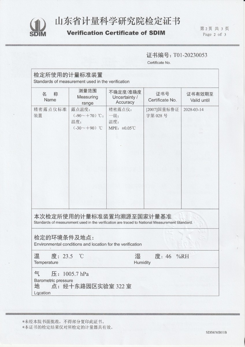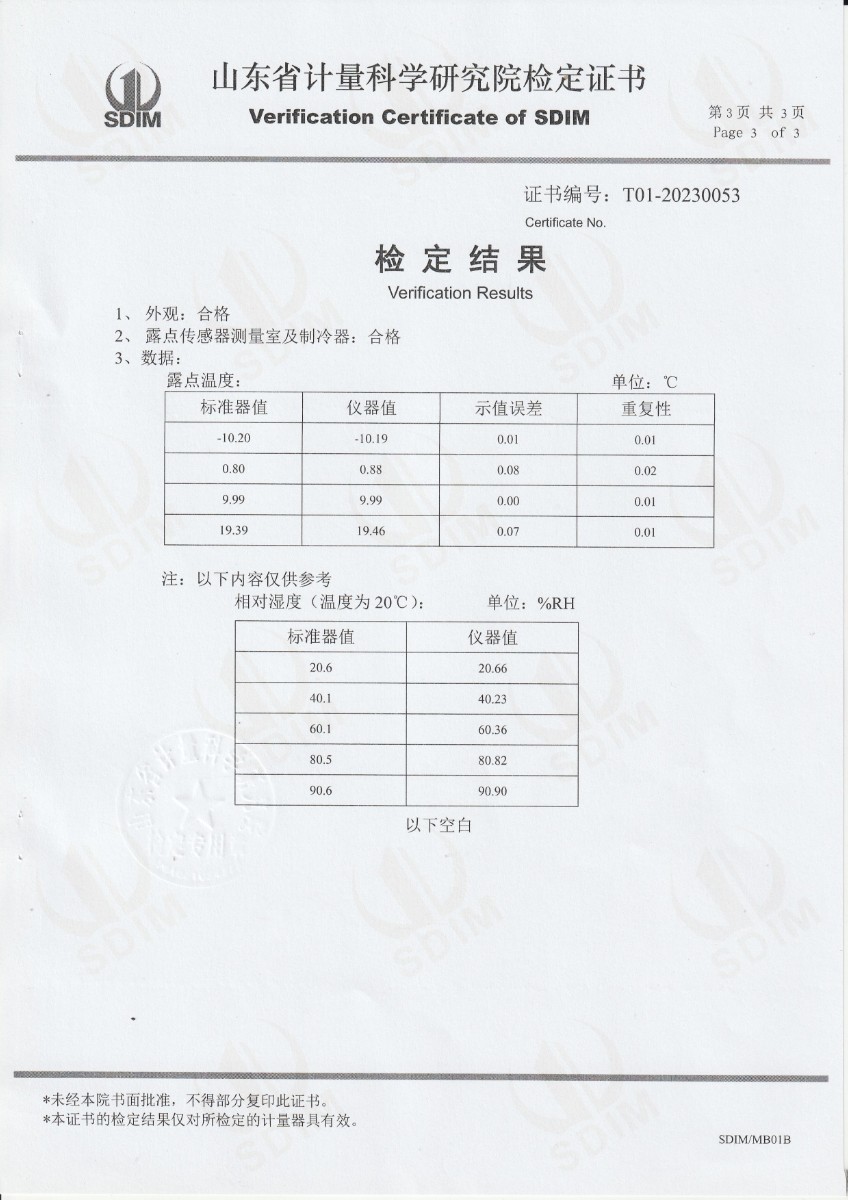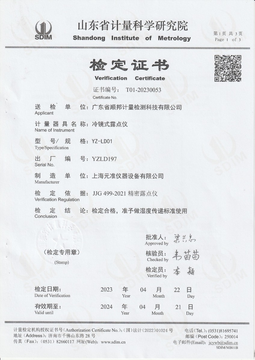 廣東省順邦計量檢測科技有限公司 冷鏡式露點儀 檢定證書 2023-5-4 本文被閱讀 9762 次