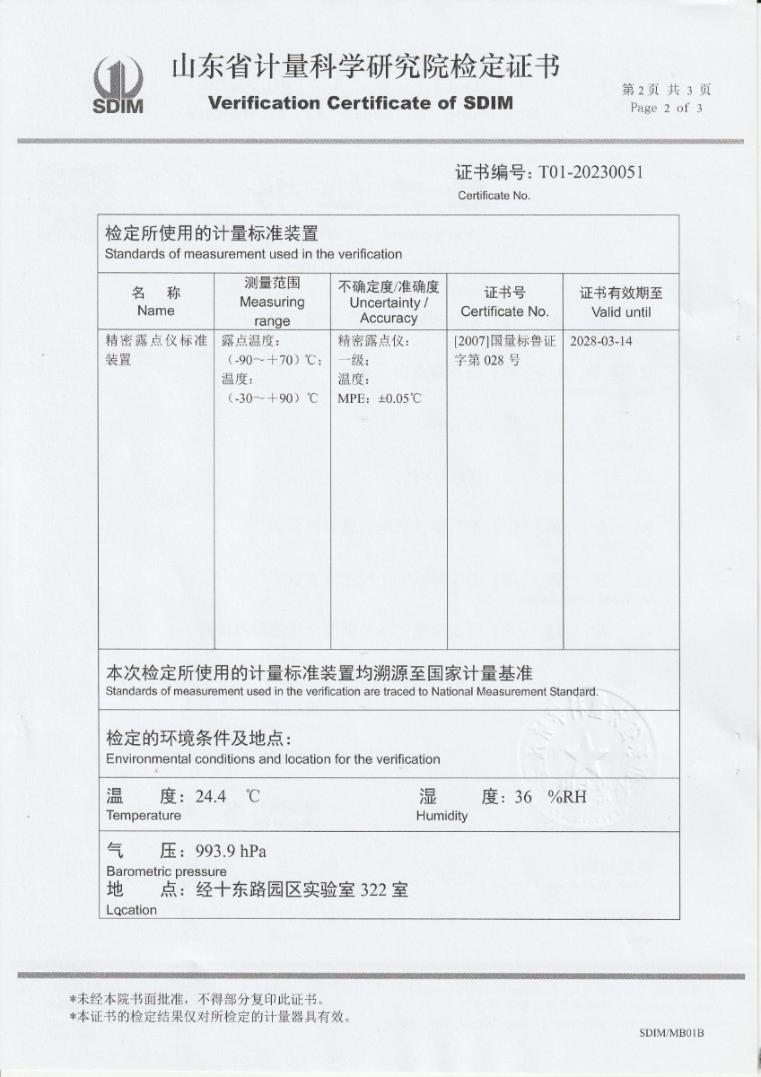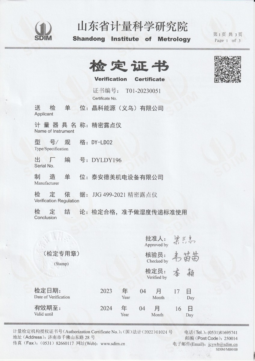 晶科能源(義烏)有限公司 精密露點儀 檢定證書 2023-5-4 本文被閱讀 12788 次