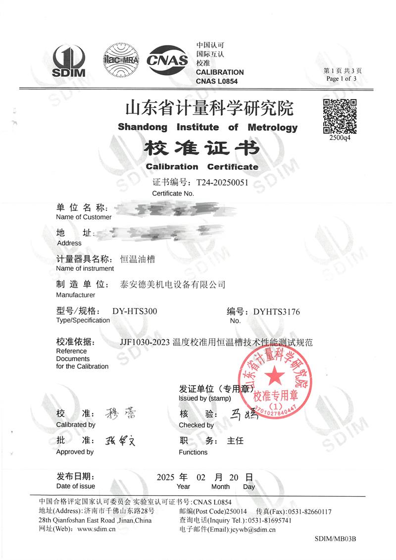 恒溫油槽(70~300℃)校準(zhǔn)證書 2025-2-26 本文被閱讀 6028 次