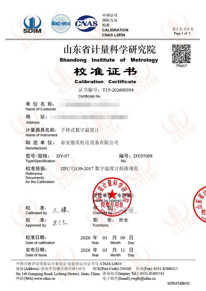 數(shù)字溫度計(jì)-校準(zhǔn)證書 2026-3-11 本文被閱讀 1082 次