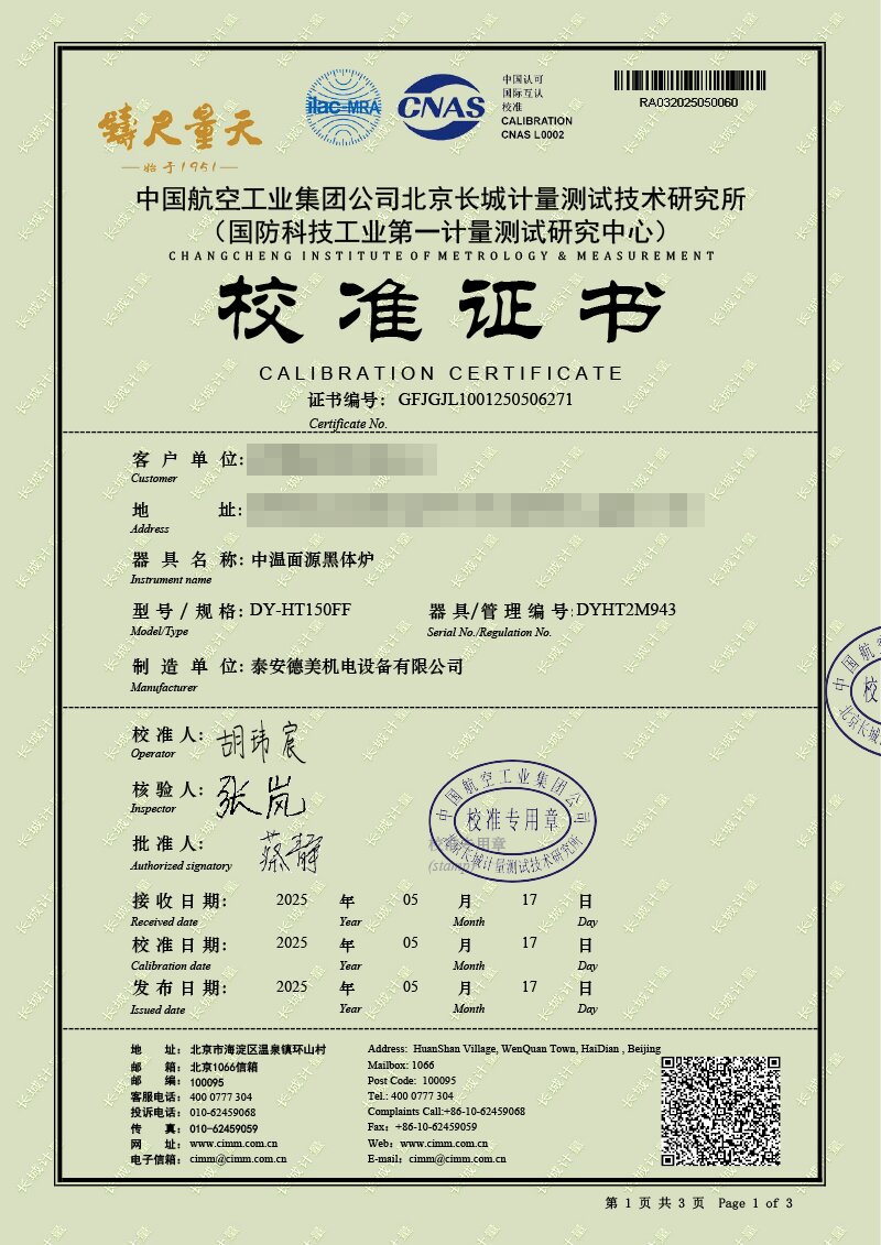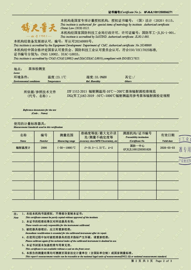 中溫面源黑體爐(室溫+5-500℃)校準證書 2025-5-21 本文被閱讀 4490 次