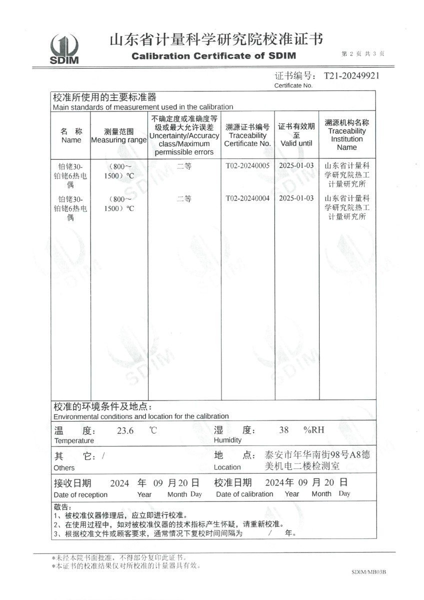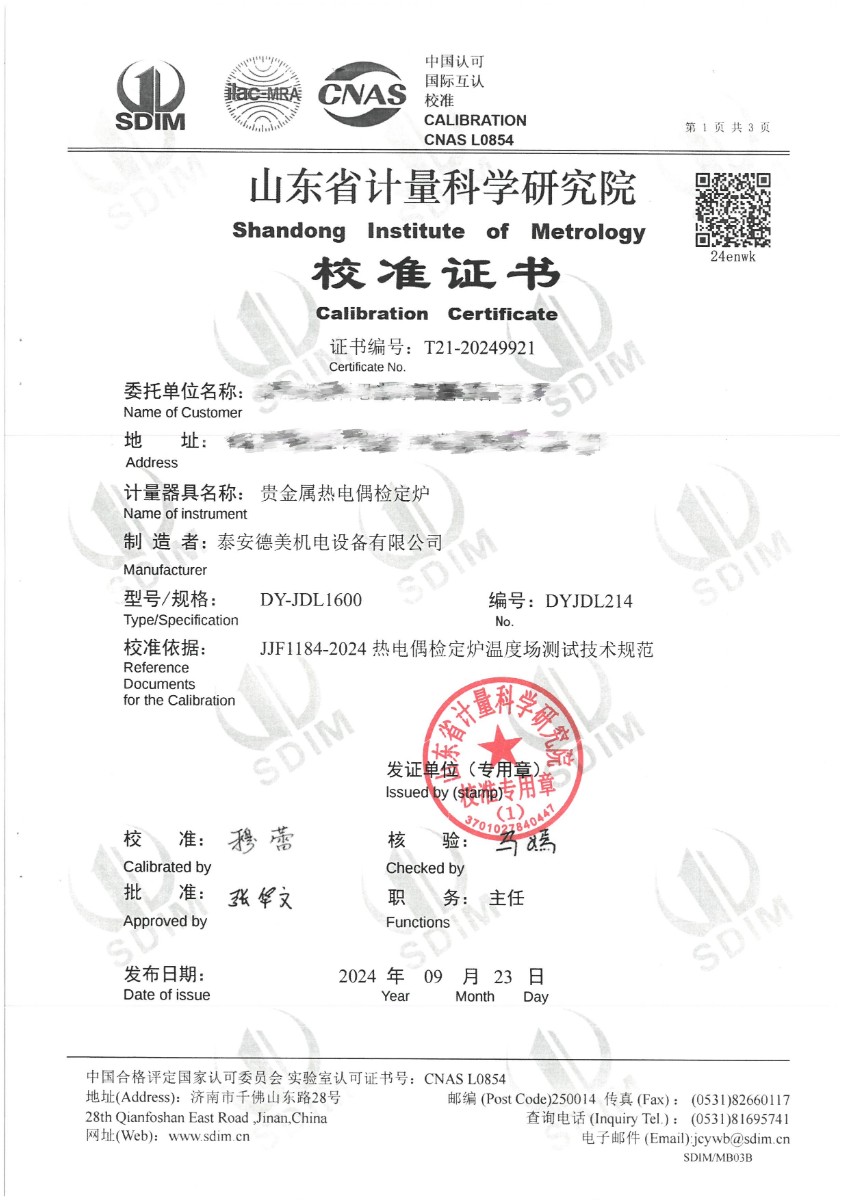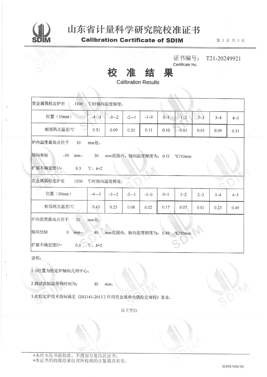 貴金屬熱電偶檢定爐(800~1600℃)校準(zhǔn)證書 2024-9-24 本文被閱讀 7053 次