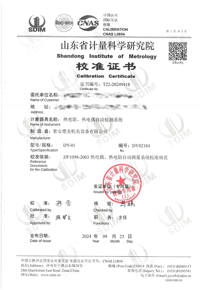 熱電阻、熱電偶自動檢測系統(tǒng)校準證書 2024-9-24 本文被閱讀 8847 次