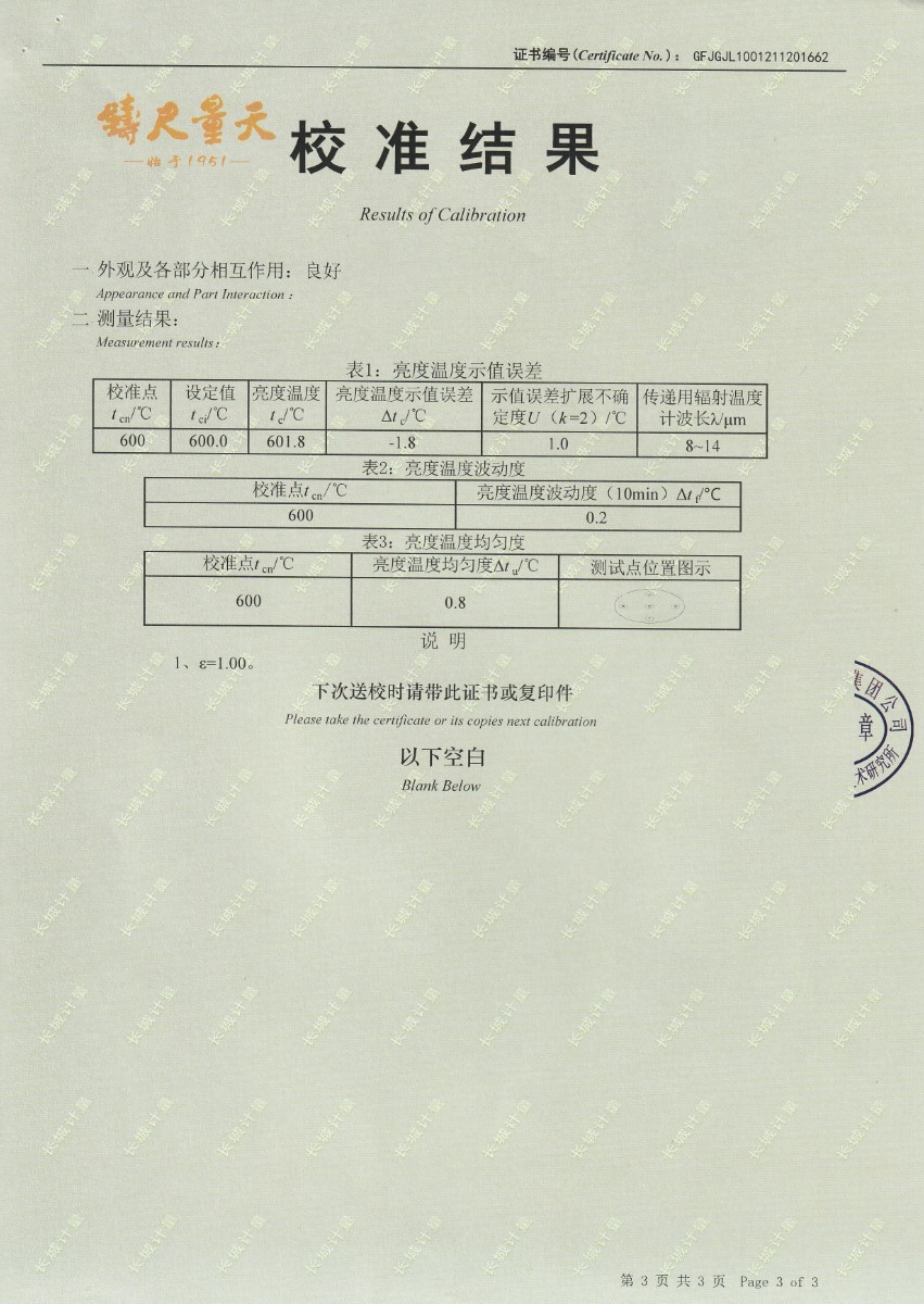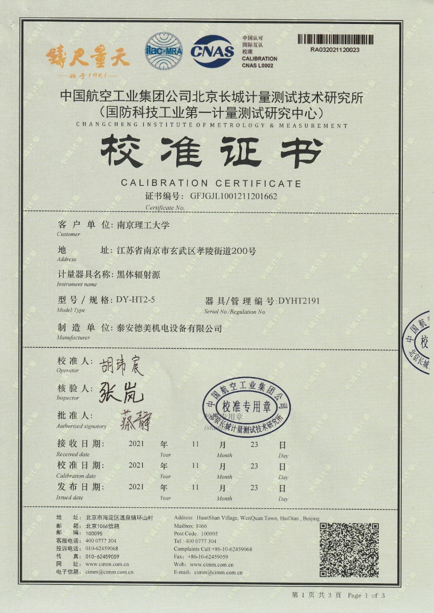 南京理工大學-黑體輻射源校準證書600℃ 2021-12-4 本文被閱讀 15346 次
