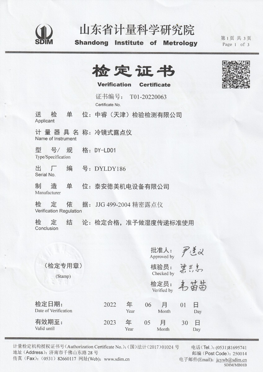 | 上一條:中睿(天津)檢驗檢測有限公司-冷鏡式露點儀校準(zhǔn)證書 | 下一條:廉金屬熱電偶檢定爐-校準(zhǔn)證書 |