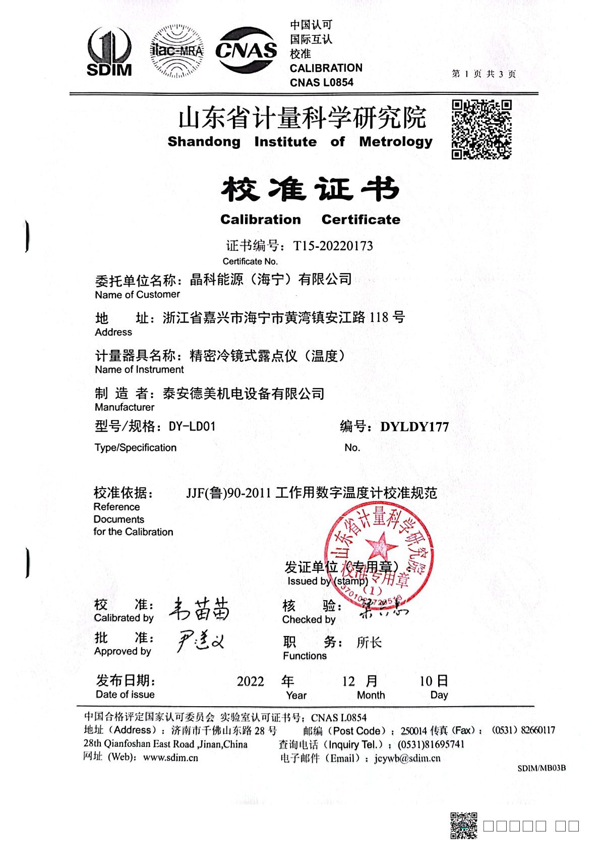 晶科能源(海寧)有限公司 精密冷鏡式露點(diǎn)儀(溫度) 校準(zhǔn)證書