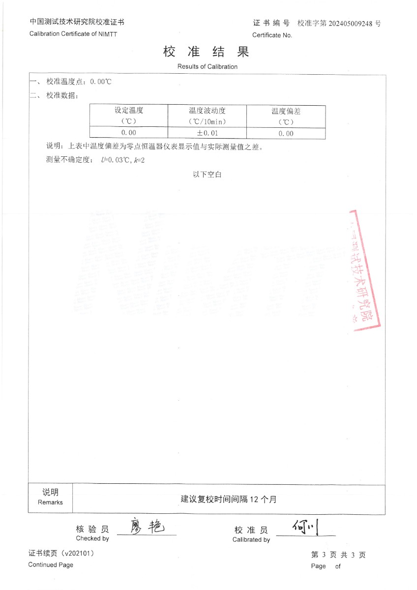 零點(diǎn)恒溫器(0℃±0.1℃)校準(zhǔn)證書