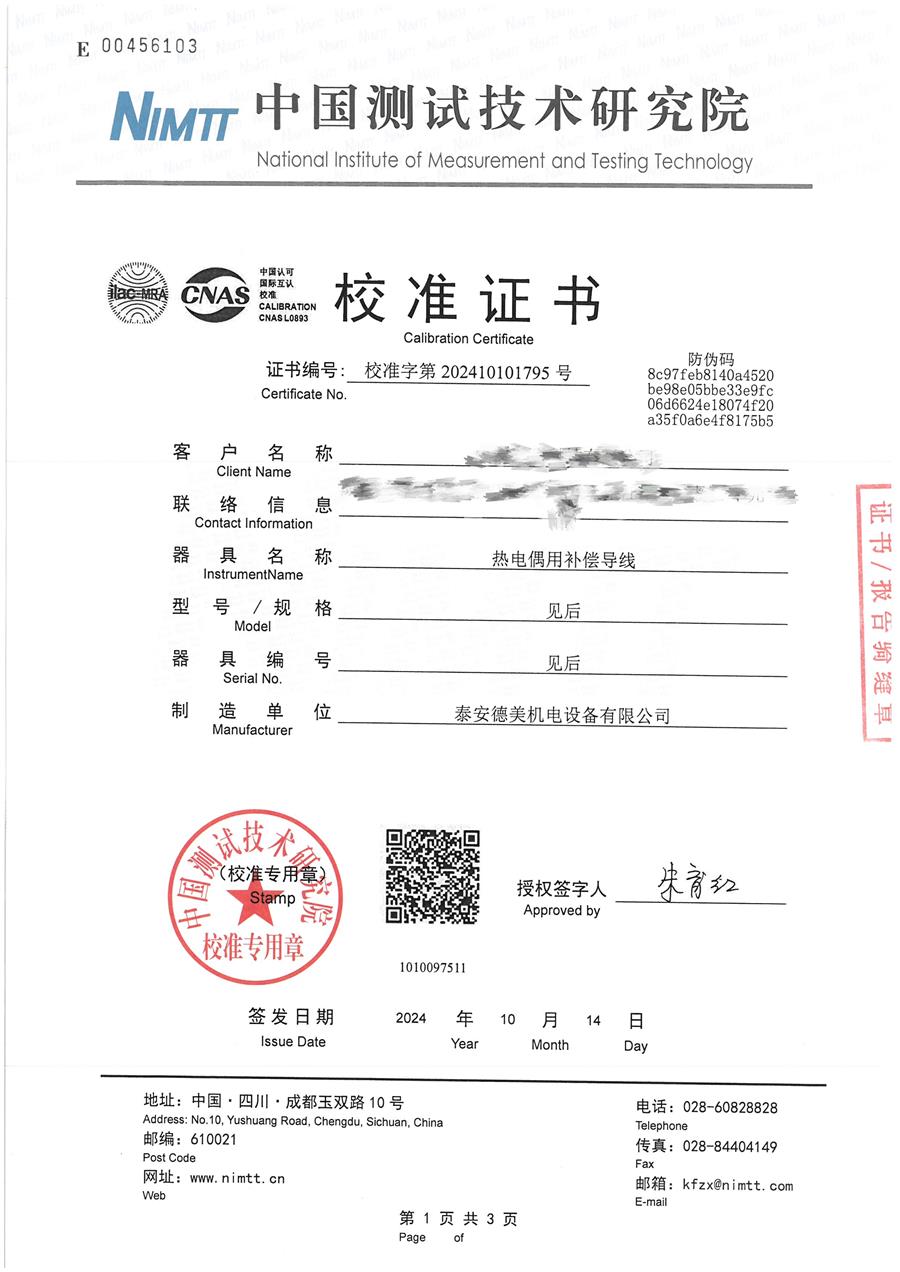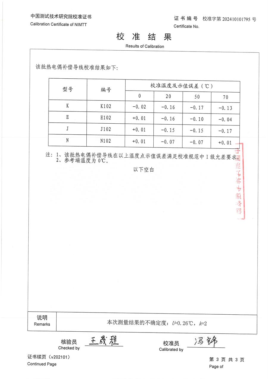 | 上一條:T分度補(bǔ)償導(dǎo)線檢定證書 | 下一條:廉金屬熱電偶檢定爐-校準(zhǔn)證書 |