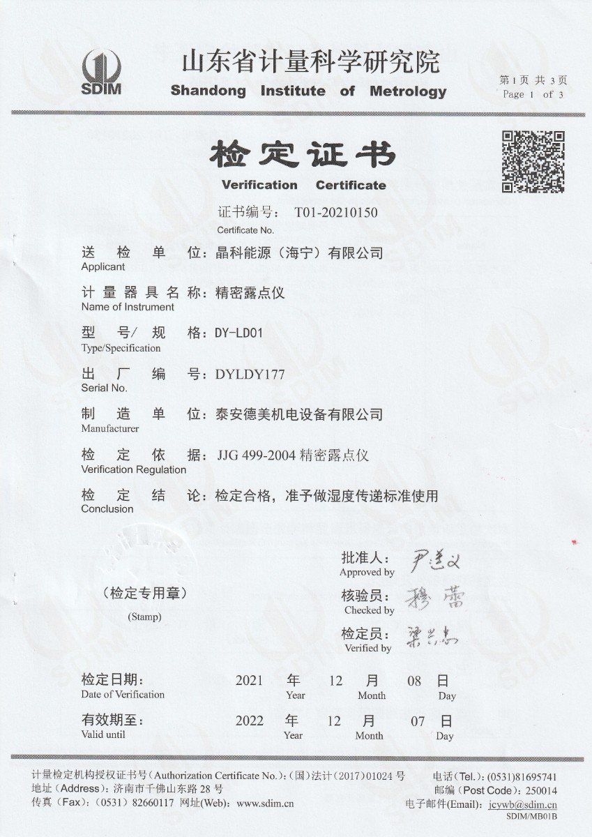 | 上一條:安徽晶科能源有限公司-精密露點(diǎn)儀(溫度) | 下一條:廉金屬熱電偶檢定爐-校準(zhǔn)證書(shū) |