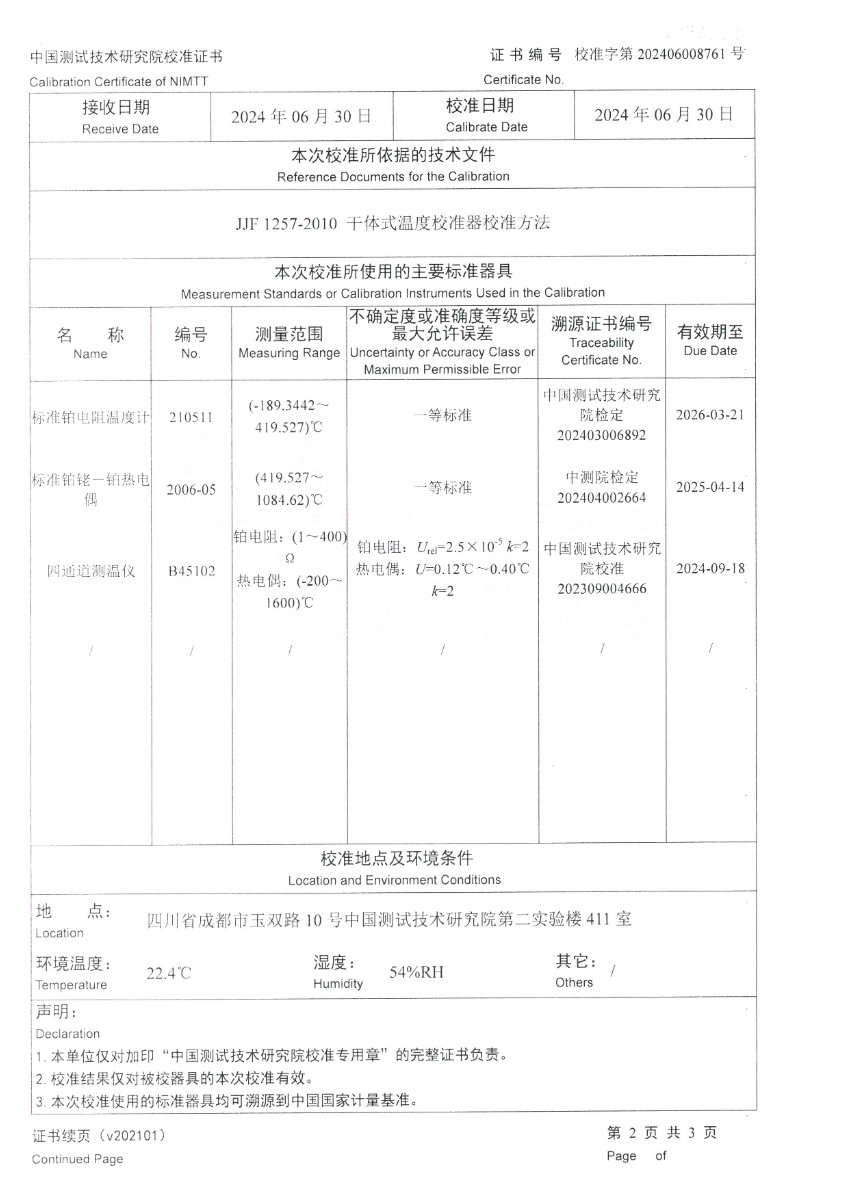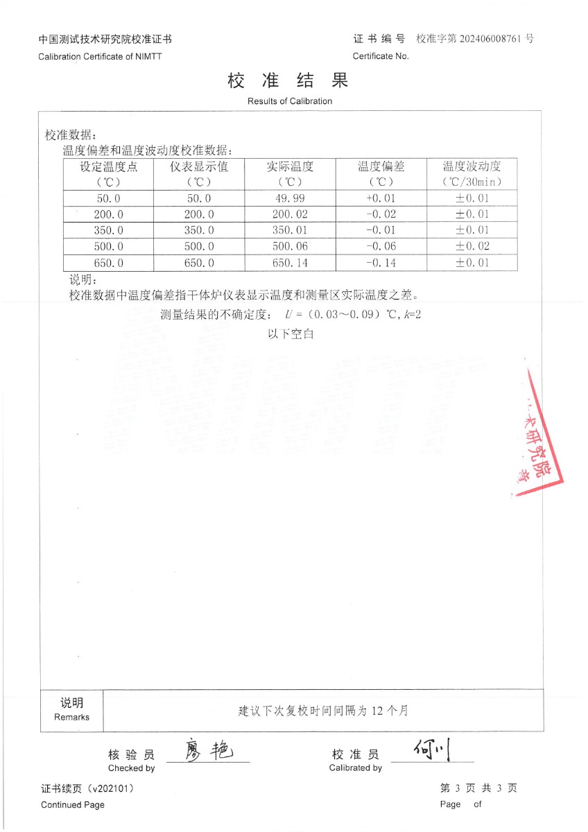 中溫干體爐295(50~650℃)校準(zhǔn)證書 2024-7-6 本文被閱讀 7075 次