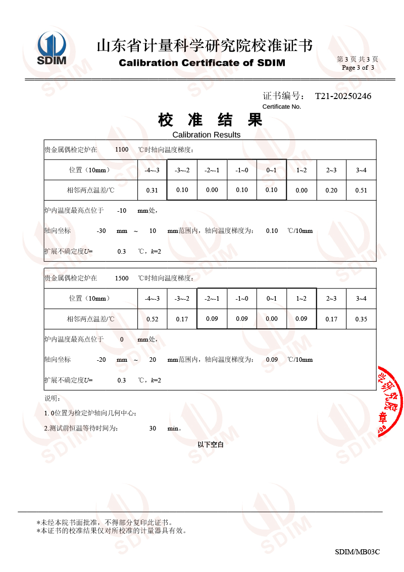高溫貴金屬熱電偶檢定爐(800-1600℃)校準(zhǔn)證書