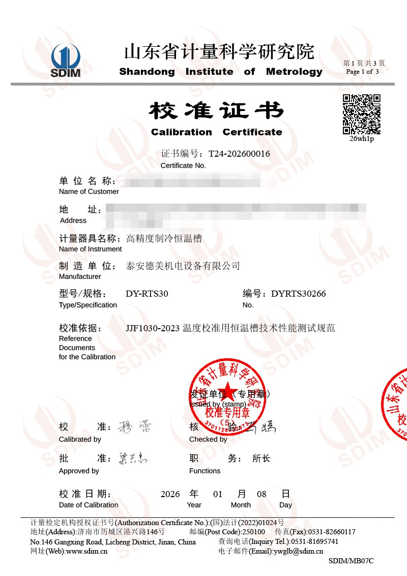 高精度制冷恒溫槽(-30~95℃)校準證書 2026-1-13 本文被閱讀 1157 次